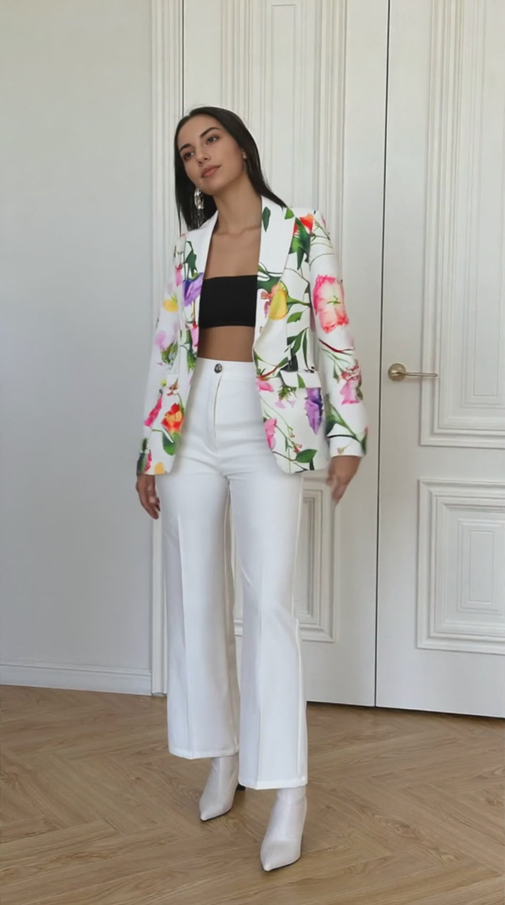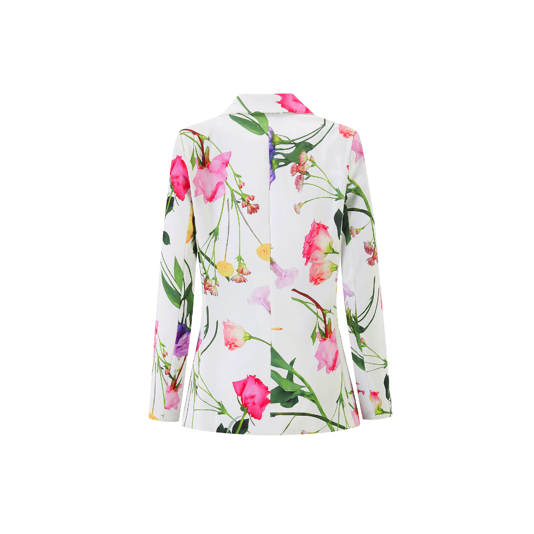 Set on a crisp white base, the jacket showcases an all-over botanical floral print. Vibrant blooms in pink, red, purple, yellow, and green create a fresh, artistic composition that brings color and movement to the design while maintaining a sophisticated balance.