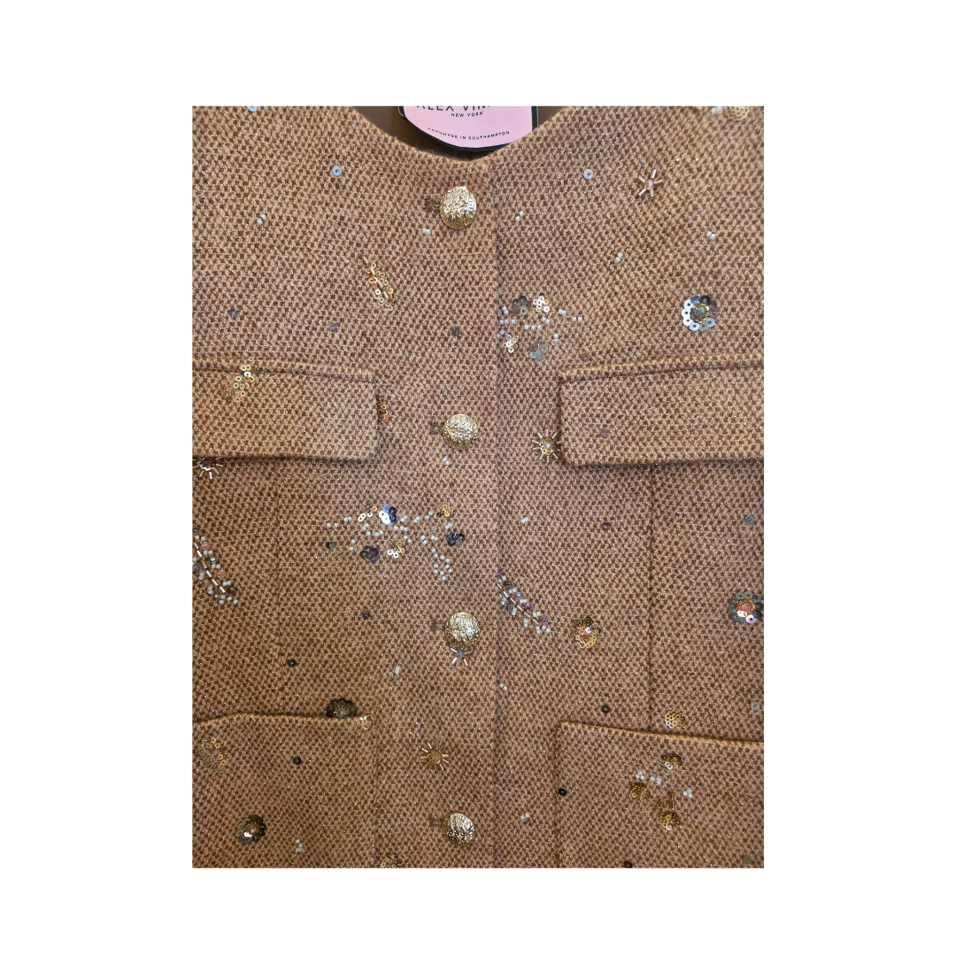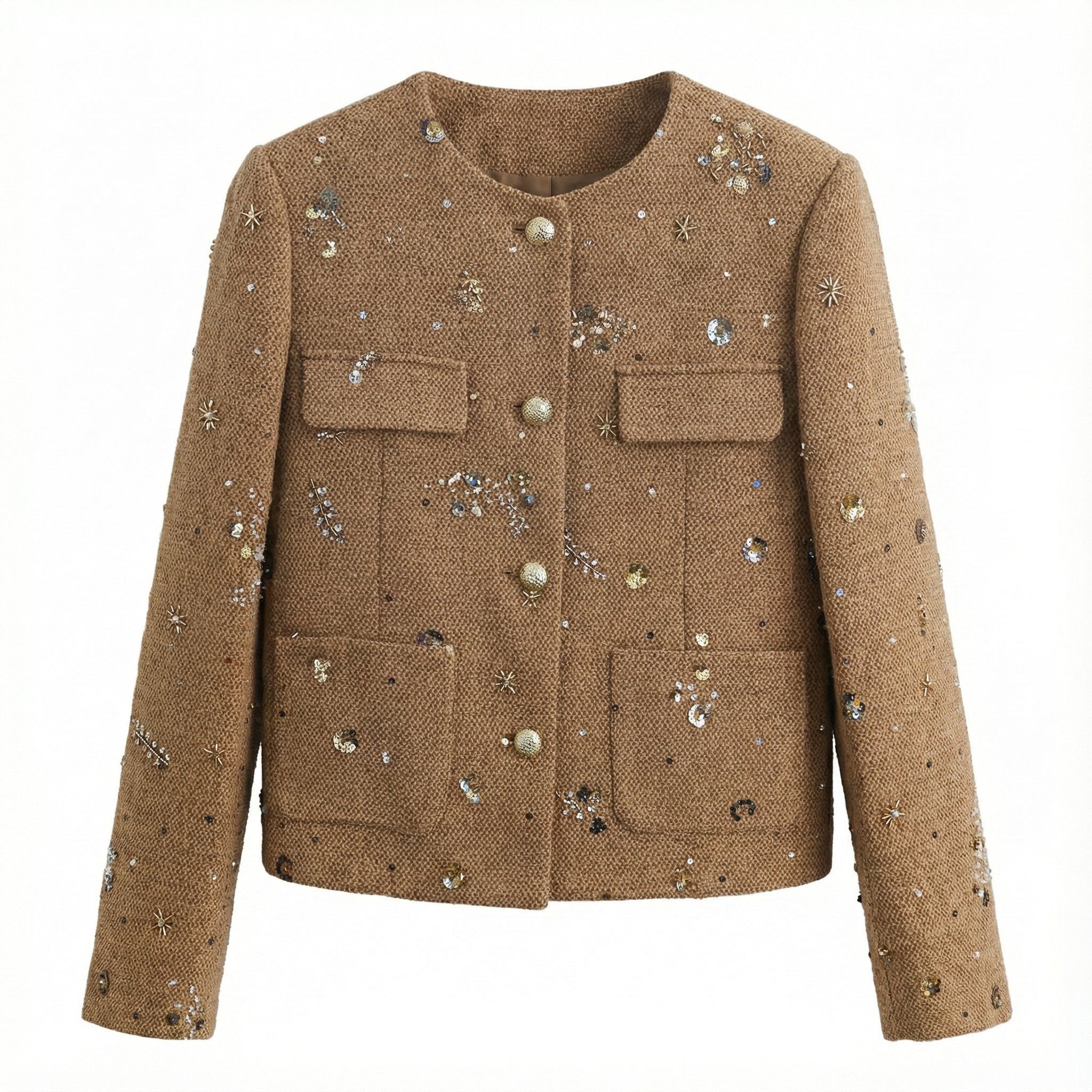 This one-of-a-kind structured jacket is crafted from a textured woven fabric in a warm camel tone and elevated with delicate hand-applied embellishments throughout. The silhouette is clean and architectural, featuring a cropped length, long sleeves, and a refined round neckline.