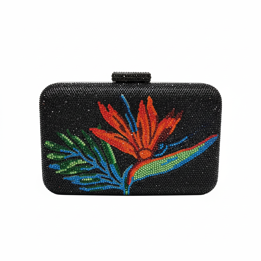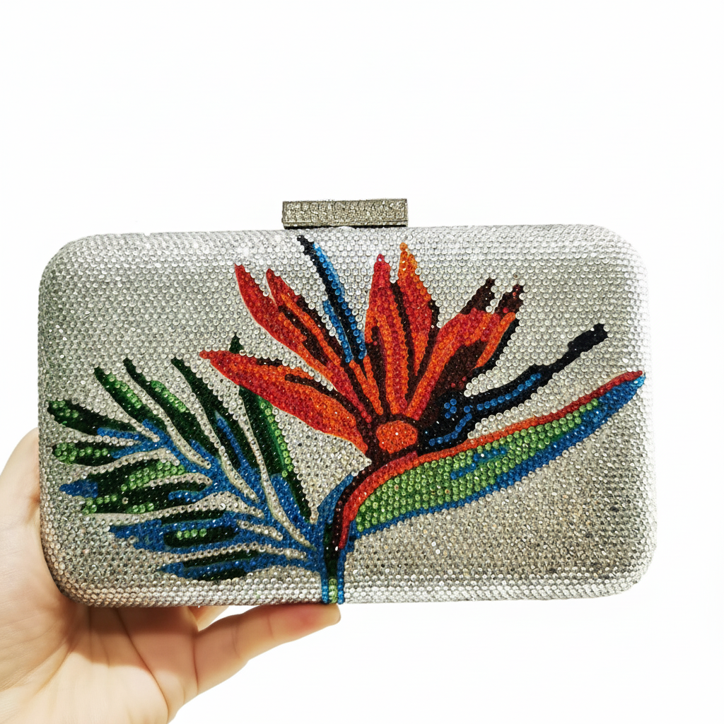 Make a dazzling statement with this Bird of Paradise Rhinestone Clutch, a luxurious accessory that combines tropical inspiration with sparkling glamour. Expertly designed in a sleek rectangular shape, it features vibrant rhinestones arranged to mimic the striking colors of a bird of paradise flower. Complete with a detachable silver strap, this clutch can be carried as a chic handheld piece or worn crossbody for versatility. Perfect for evening events, parties, or any occasion where you want to shine, this clutch brings elegance, color, and artistry together in one eye-catching accessory.