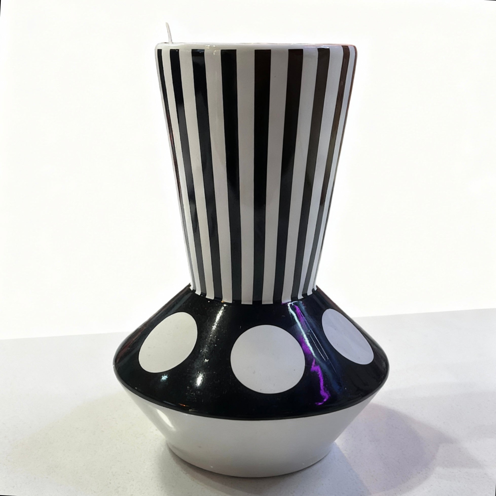 Bring a touch of artistic nostalgia to your home with this Black and White Retro Vase, inspired by the bold and graphic designs of the 1970s. Its sculptural silhouette and high-contrast color palette create a striking visual statement that effortlessly complements both modern and vintage interiors. Crafted from fine ceramic with a smooth, glossy finish, this vase captures the spirit of mid-century artistry while remaining timeless in style. Perfect as a standalone décor piece or as a vessel for flowers, it embodies both sophistication and playfulness — a true conversation starter for any space.