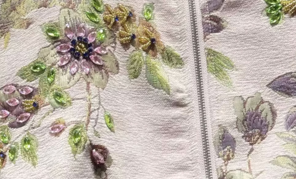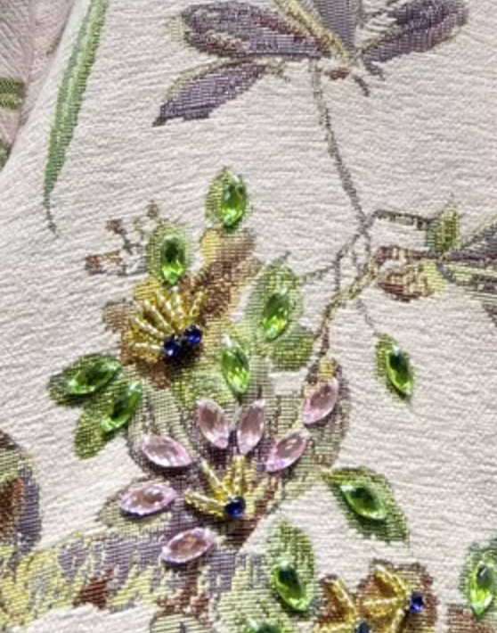 Set on a muted blush pink base, the jacket is finished with an all-over botanical print depicting floral branches and foliage in soft green, lavender, and earthy tones. Select floral motifs are enhanced with delicate embellishments, adding subtle texture and dimension without overpowering the design.