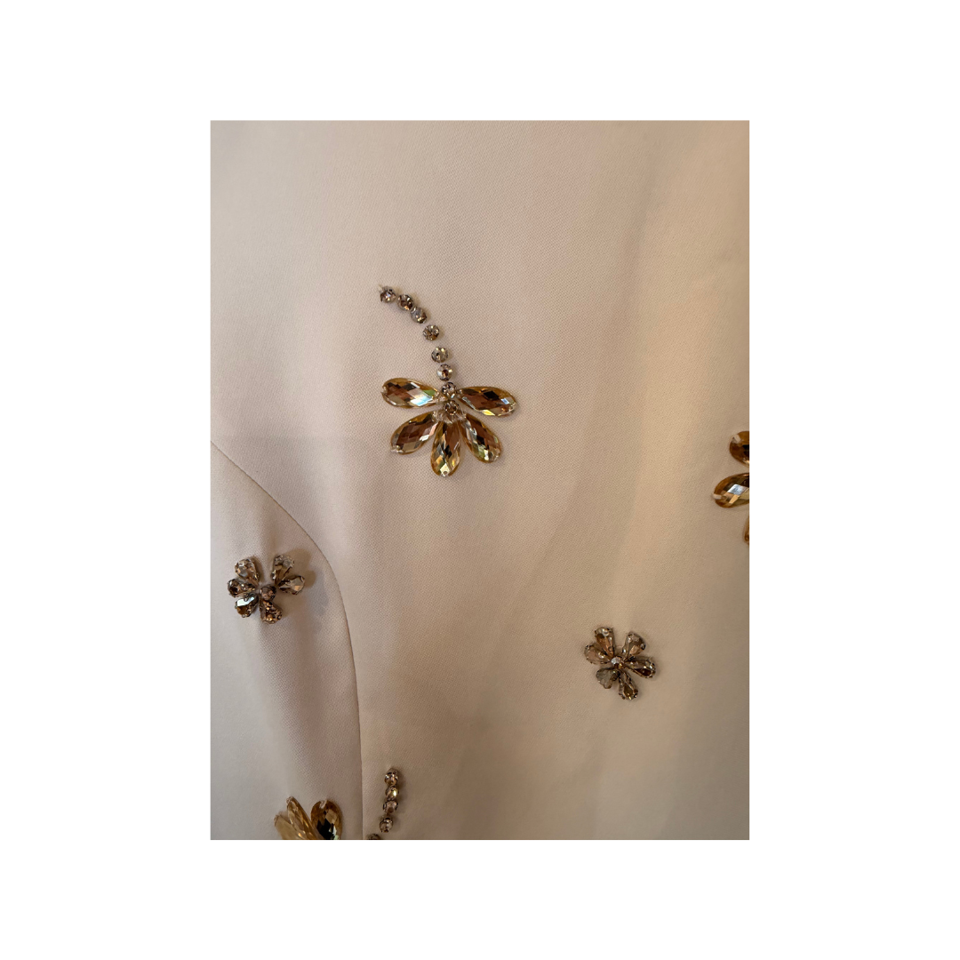 This white dress is hand-embellished with golden stones, individually applied to form delicate floral motifs across the bodice and skirt. The embellishment adds subtle shine and texture, catching the light without overpowering the clean silhouette. Crafted with a structured yet feminine shape, the dress balances refined tailoring with artisanal detailing.