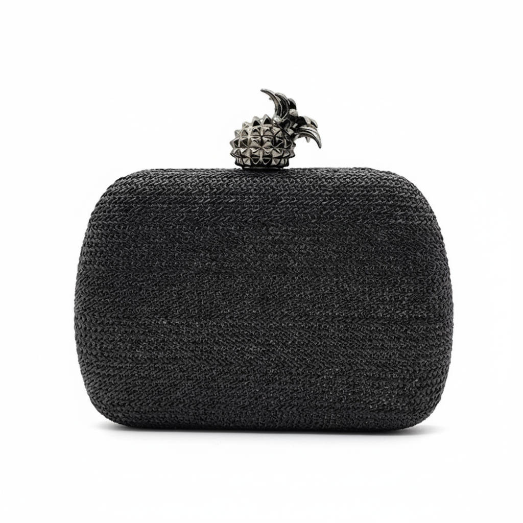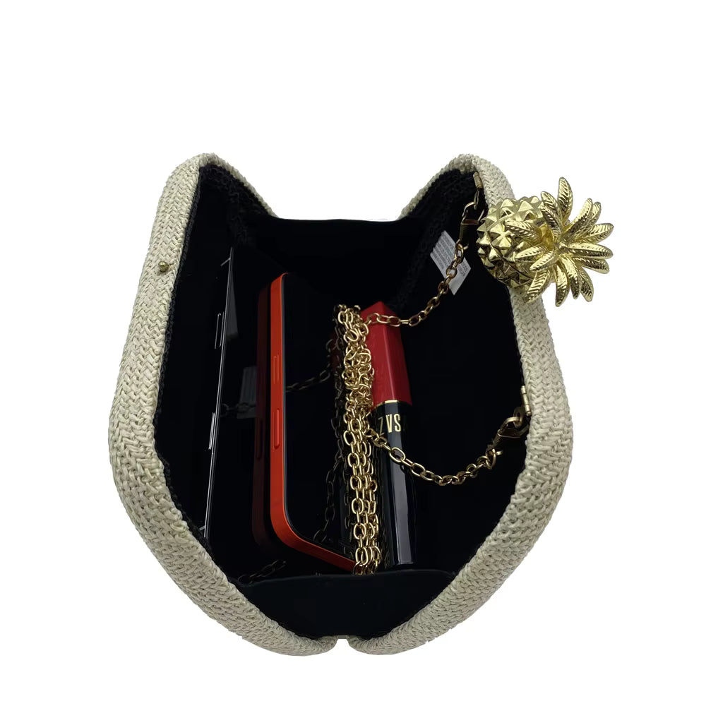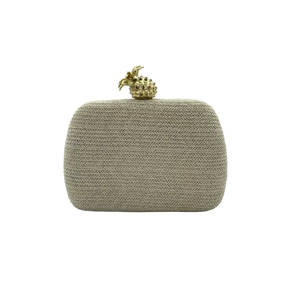 Make a playful yet elegant statement with this Rattan Clutch, adorned with a striking gold pineapple detail at the top. Handwoven from natural rattan, this clutch showcases artisanal craftsmanship while adding a touch of tropical charm. Designed with a detachable gold chain, it offers versatile wear — carry it by...