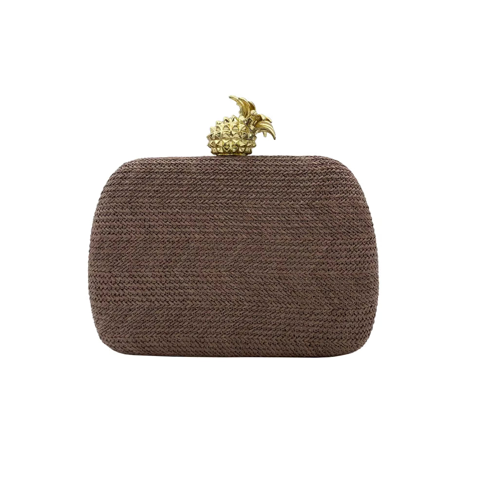 Make a playful yet elegant statement with this Rattan Clutch, adorned with a striking gold pineapple detail at the top. Handwoven from natural rattan, this clutch showcases artisanal craftsmanship while adding a touch of tropical charm. Designed with a detachable gold chain, it offers versatile wear — carry it by hand for a sophisticated evening look or wear it crossbody for convenience. Available in a variety of colors, this clutch is both lightweight and durable, making it the perfect accessory to elevate summer outfits, beachside looks, or festive evenings. A chic blend of nature-inspired design and modern glamor, it’s sure to turn heads.